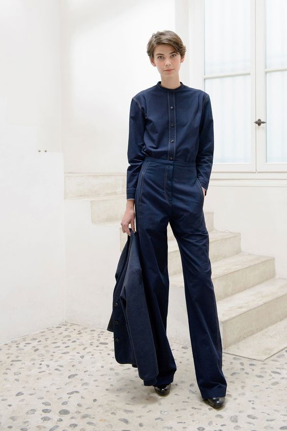 Denim on denim is a trend celebrating the double denim look of the 80's and 90's. Authenticity is key ideas from the work wear at that time. Fabrication and washes are the tastes of the authentic denim. Ring spun denim and red selvedge jeans are in great demand. But now in 2018, women's denim trend becomes more fashion oriented. Detail, shape and style are the main spirit. Raw denim is main stream. Off the shoulder and the wrong buttoning make the look more styling focus. Patchwork and fringes and ripped off are basic touches. Oversize jacket, wide jeans, super short, super tight and super long are options for sexy or boyish approaches. After all, one piece of denim is not enough, make it double is the effective way to enhance this denim fashion movement.